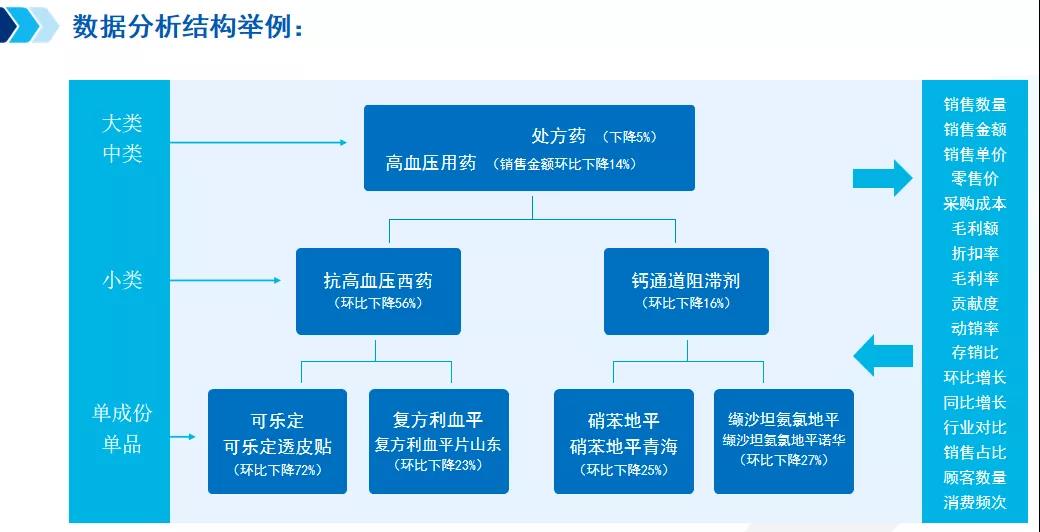 得出分析結(jié)果,提升方案就唾手可得了嗎?并不!確定了核心增長品類之后,需從整體到大類、中類、小類、單成分單品進(jìn)行抽絲剝繭,基于多維逐層分析,最后才能精準(zhǔn)地制定出提升方案。