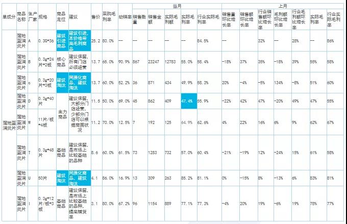 大類分析主要看整體銷售結(jié)構(gòu),找出核心大類的增長機(jī)會點(diǎn)。例如,這組數(shù)據(jù)中不管是整體毛利率還是銷售額增長率,都低于行業(yè)均值。細(xì)分處方藥、非處方藥及中藥等品類的情況可以看出,處方藥的同環(huán)比銷售額以及銷售占比均低于行業(yè)值,而毛利率卻高于行業(yè)值?梢缘贸,年初制定處方藥為核心增長大類的策略沒有落地。所以,接下來做中類、小類跟單成分分析的時候需要進(jìn)行針對性監(jiān)控。