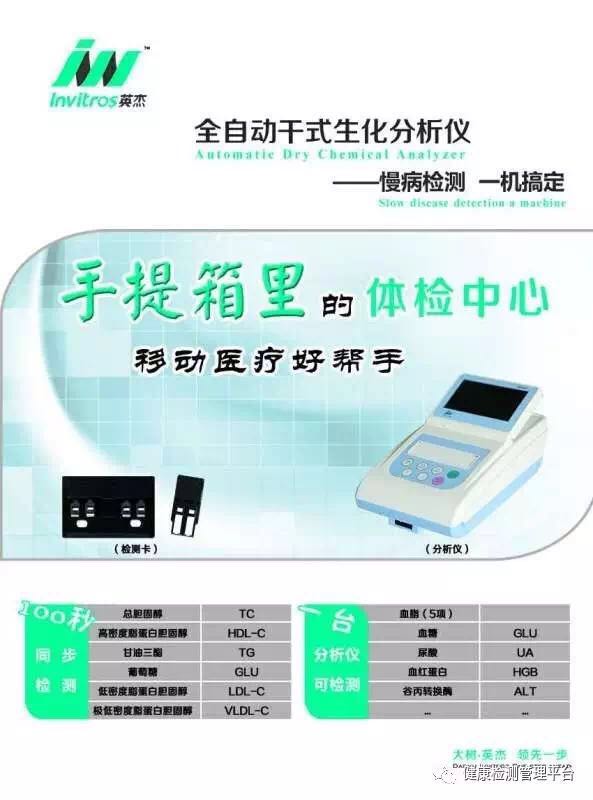 南京大樹英杰——全自動干式生化分析儀,100秒同步檢測總膽固醇、高密度脂蛋白膽固醇、甘油三酯、葡萄糖、低密度脂蛋白膽固醇、極低密度脂蛋白膽固醇,尿酸,血紅蛋白和谷丙轉(zhuǎn)氨酶。手提箱里的體檢中心,移動醫(yī)療好幫手。!